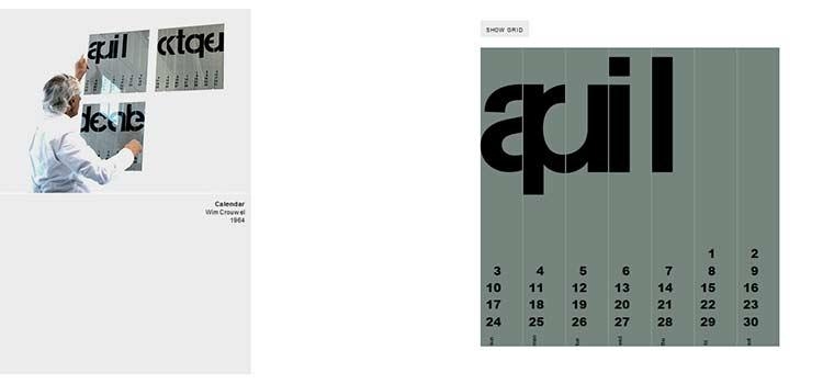 Wim Crouwel được biết đến là một Dutch graphic designer nổi tiếng trong việc sử dụng layout grid đầu những năm 1960. Những thiết kế của ông vẫn còn rất nhiều giá trị cho đến ngày nay, và truyền cảm hứng mạnh mẽ cho các designer khác. Đặt biệt thiết kế nỗi tiếng của ông là Calendar giờ đây đã được Chris Droom thực hiện hóa trên website bằng grid