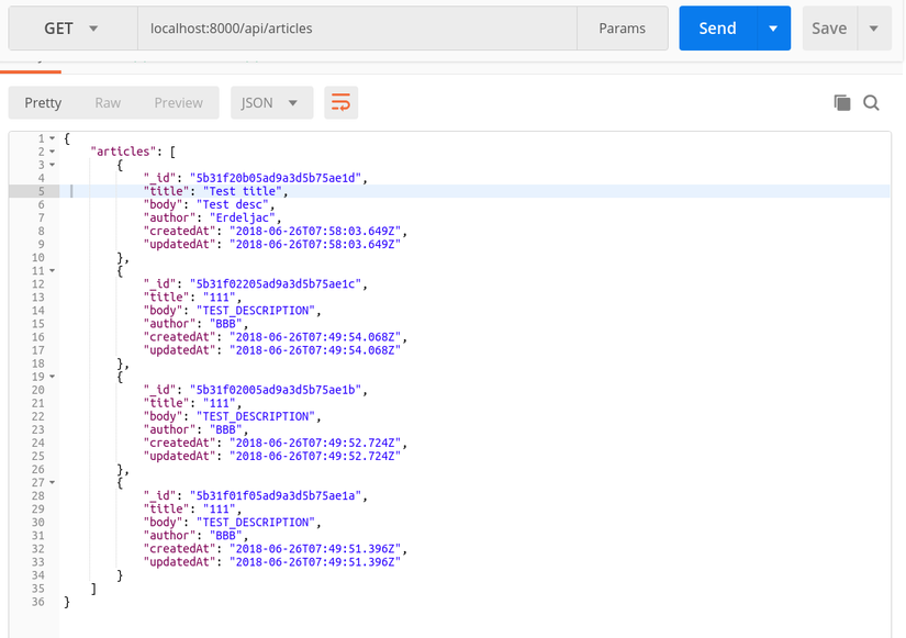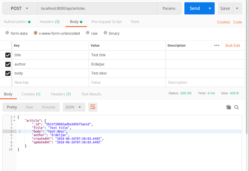 Công việc xây dựng phía backend coi như là hoàn chỉnh, công việc tiếp theo là test API hoạt động như thế nào nhé. POST localhost:8000/api/articles/ để tạo một blog với body như nhau: