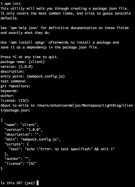 Sau đó chúng ta run npm init để khởi tạo npm để quản lí package: